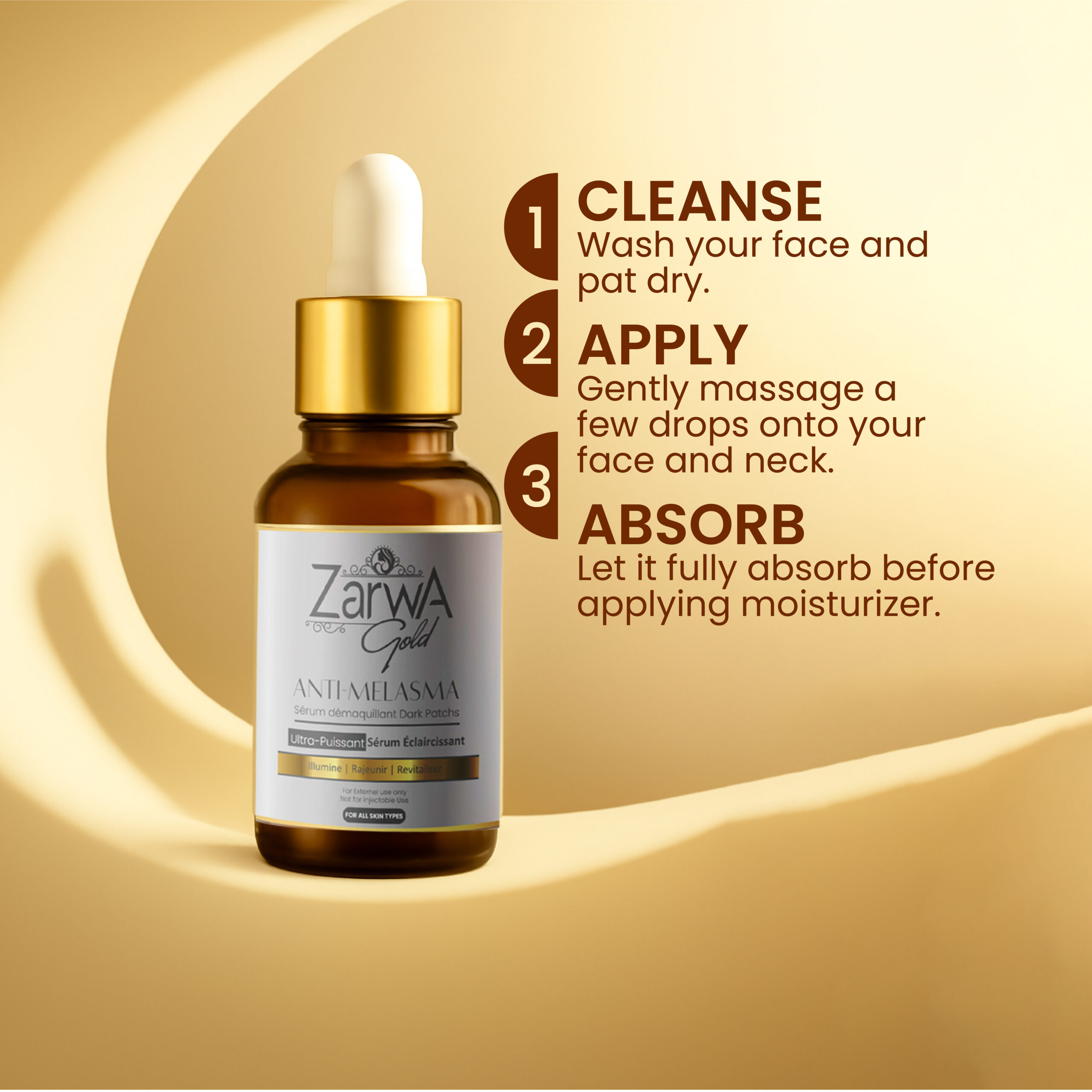 A specialized skincare product called Zarwa Anti-Melasma Face Serum is intended to counter the symptoms of melasma, a common skin condition that causes dark spots on the skin. Enriched in powerful ingredients, this serum works deep down to target the root cause of hyperpigmentation. The product’s composition evens out skin tone, minimizes dark spots, and gives the skin a radiant appearance.