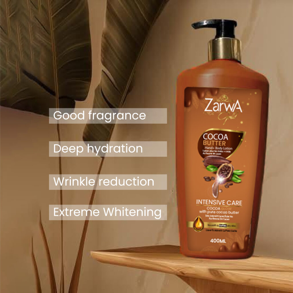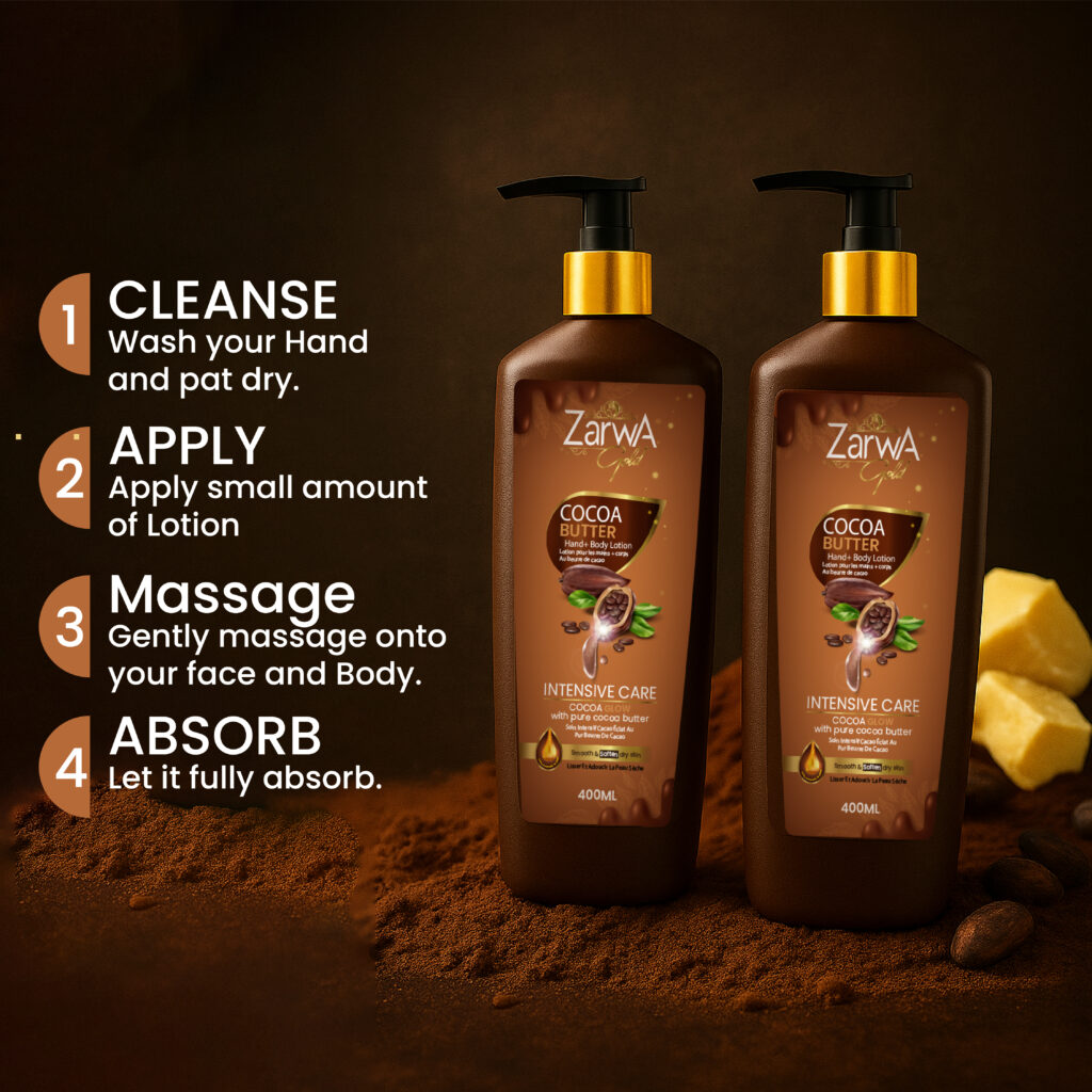 Apply Zarwa Cocoa Moisturizing Lotion generously to clean skin. Massage gently until fully