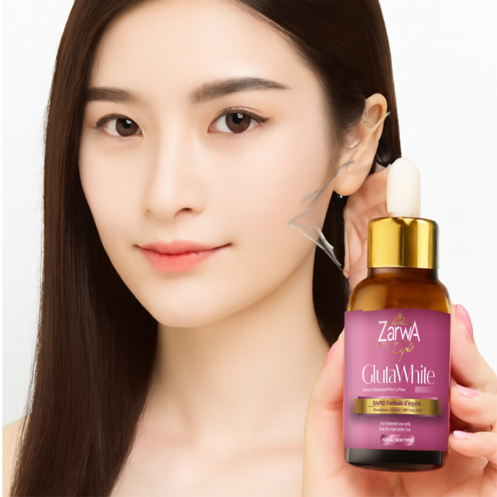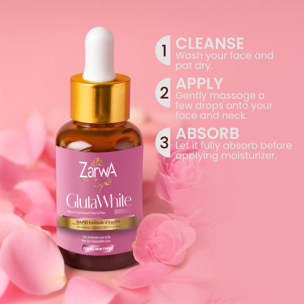 Apply 2–3 drops of Zarwa Gluta White Skin Whitening Serum on clean, dry skin. Gently