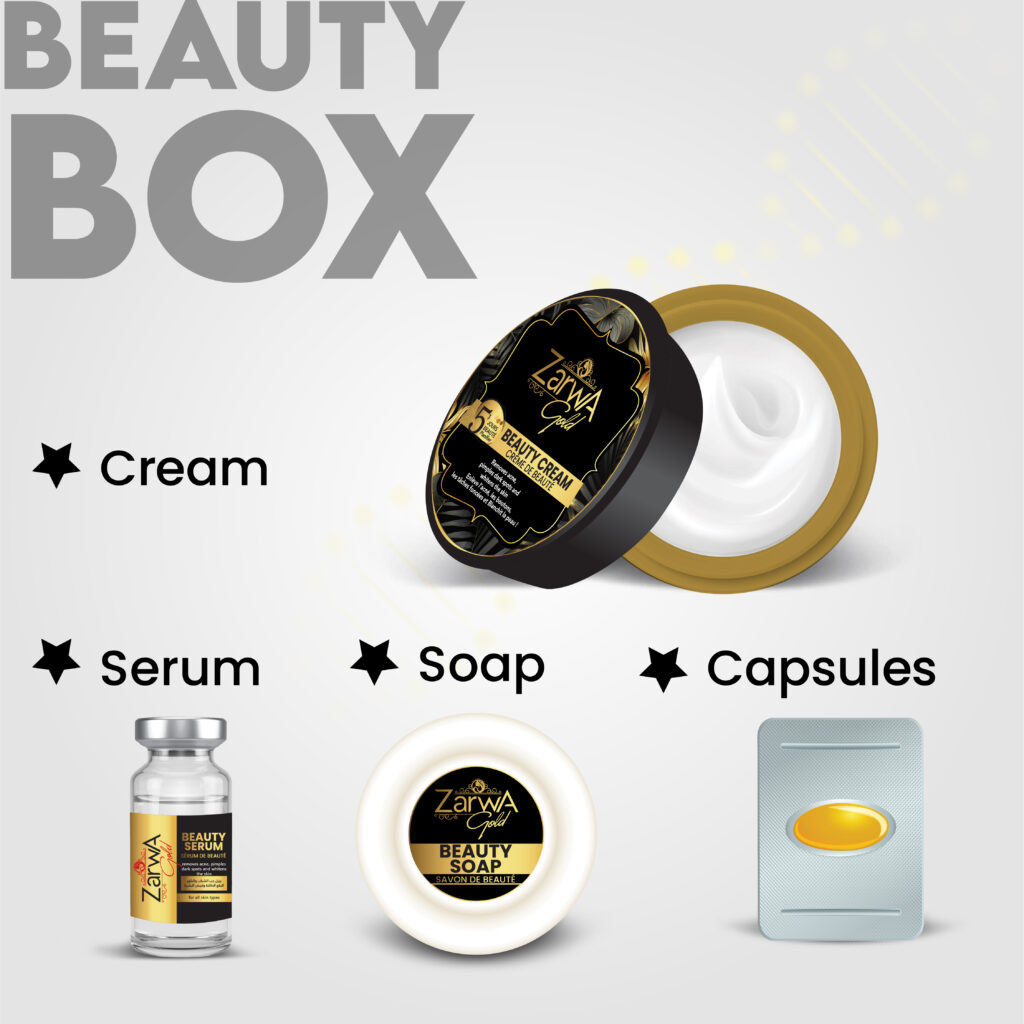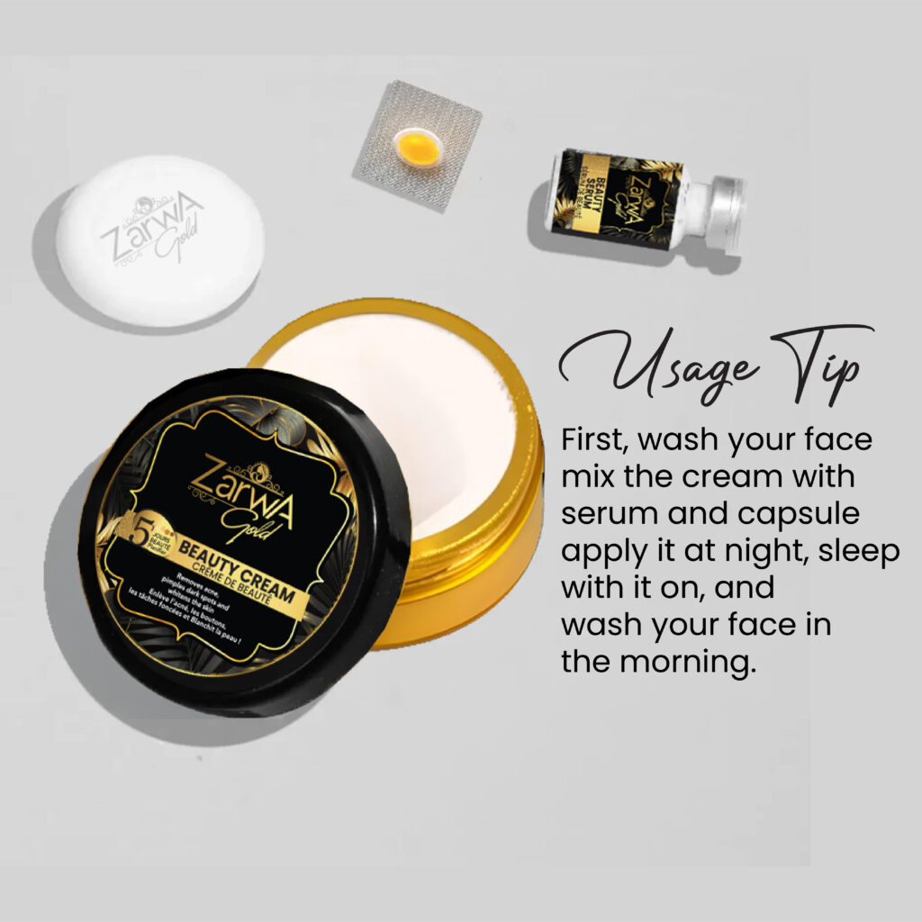 Apply the Zarwa Golden Beauty Box 4-in-1 Beauty Cream on cleaned skin for best results. First wash your face with soap. Then mix the serum and the capsule thoroughly. After mixing, pour the mixture into the cream jar. Apply the cream on your face every night before going to bed. Apply regularly for a whole skincare routine that reveals a glowing, refreshed complexion.