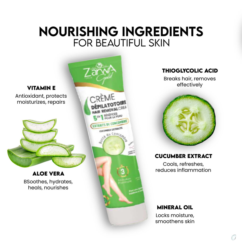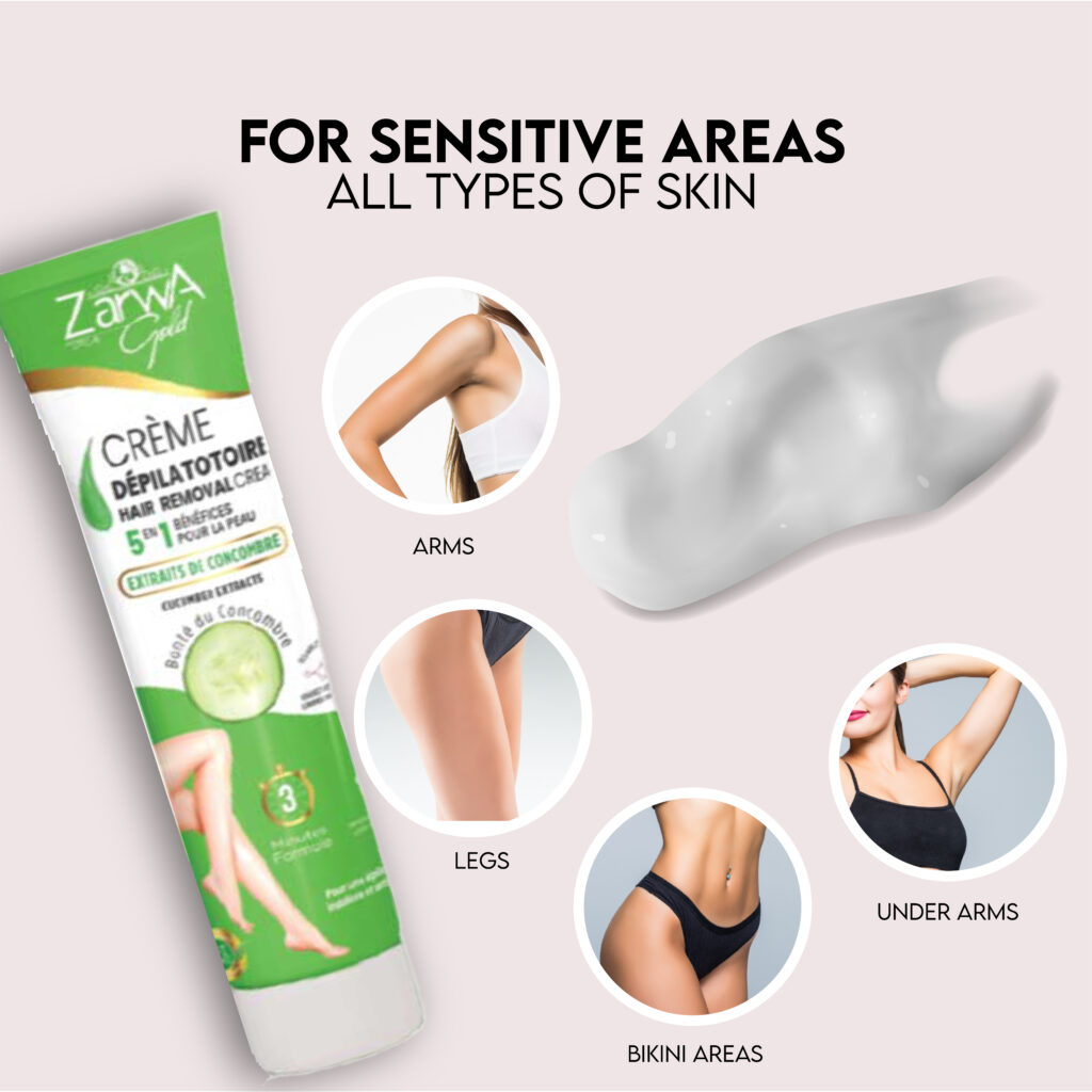 1. Apply a thin, even layer of Zarwa Hair Removal Cream Cucumber on clean, dry skin.
