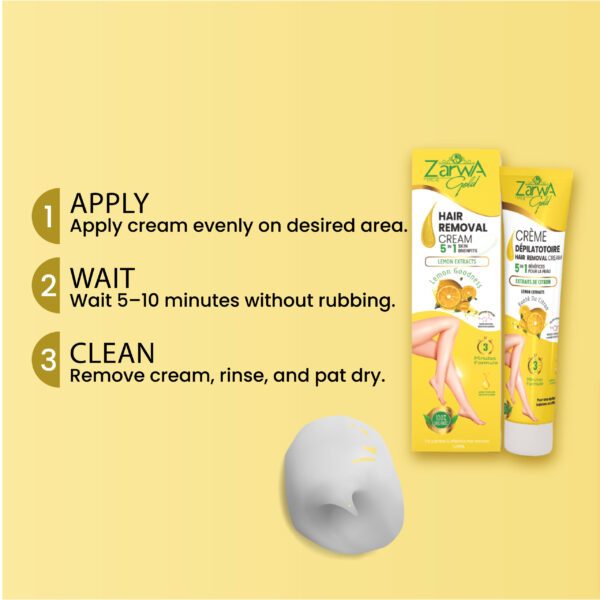 1. Apply a thin, even layer of Zarwa Hair Removal Cream Lemon to clean, dry skin.