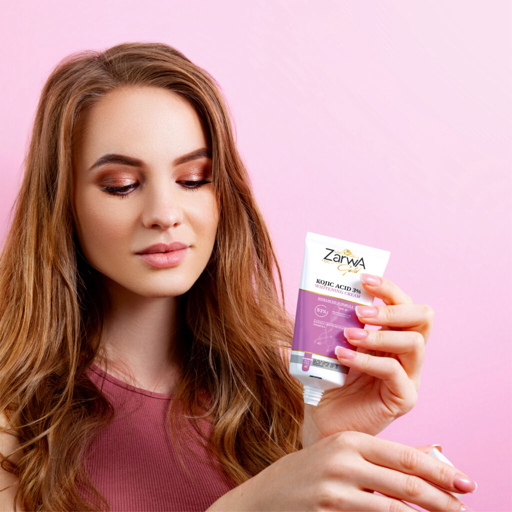 Zarwa Kojic 3% Whitening Cream SPF 30 is an advanced brightening formula designed to reduce pigmentation, fade dark spots, and even out skin tone. Enriched with 3% Kojic Acid, it helps lighten stubborn marks, acne scars, and sun tanning while promoting a visibly brighter and smoother complexion.