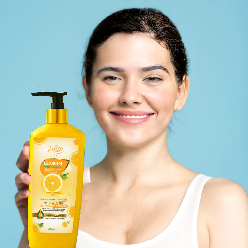 Apply Zarwa Lemon Whitening Lotion evenly to clean skin. Massage gently until fully