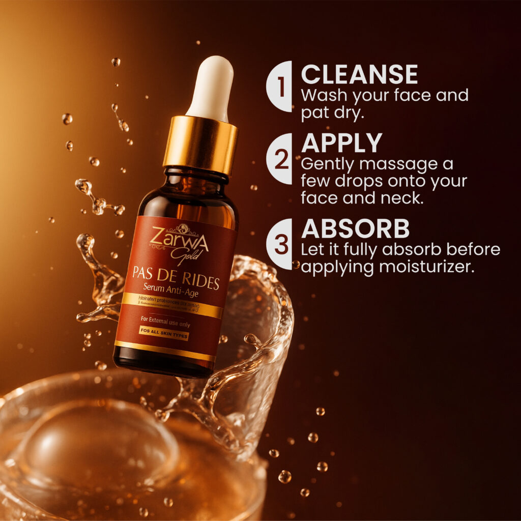 Apply 2–3 drops of Zarwa Non-Wrinkle Serum onto clean, dry skin. Gently massage in circular motions until fully absorbed. Use morning and evening for optimal anti-aging results. Follow with moisturizer or sunscreen during the day.
